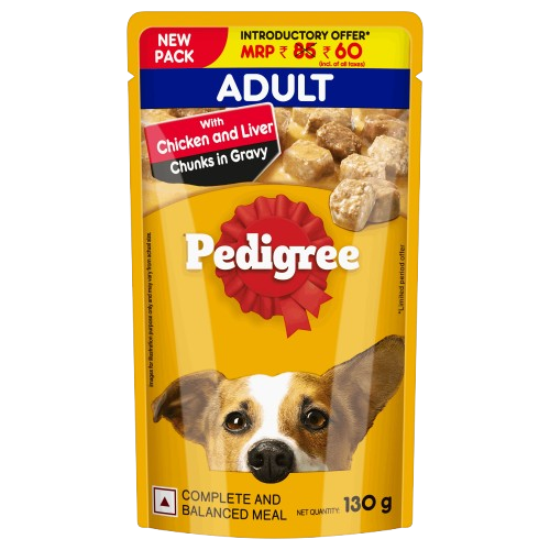Treat your dog to a delicious, complete meal formulated especially for adult dogs with Pedigree chicken and liver chunks in gravy. This tasty adult dog food combines real chicken and liver chunks in a rich, flavour-packed gravy to deliver both taste and nutrition. According to Pet India, it is described as “moist chicken chunks gently cooked in healthy gravy, retaining vitamins, complete & balanced food for adult dogs”. Flipkart